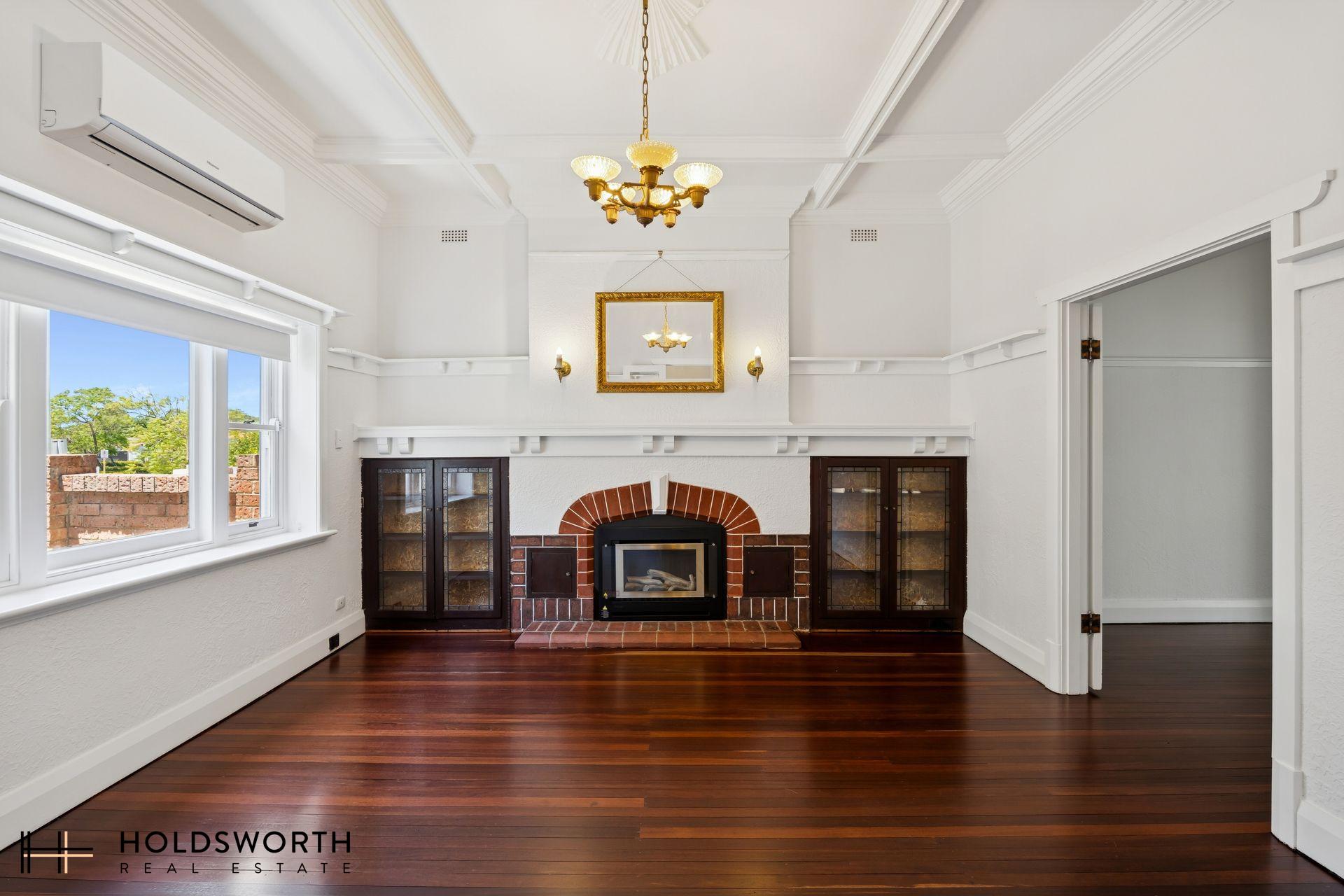 • Light-filled front lounge with polished jarrah floorboards, original fireplace, timber cornicing, ceiling roses, mantelpiece, soaring ceilings and split system air conditioning