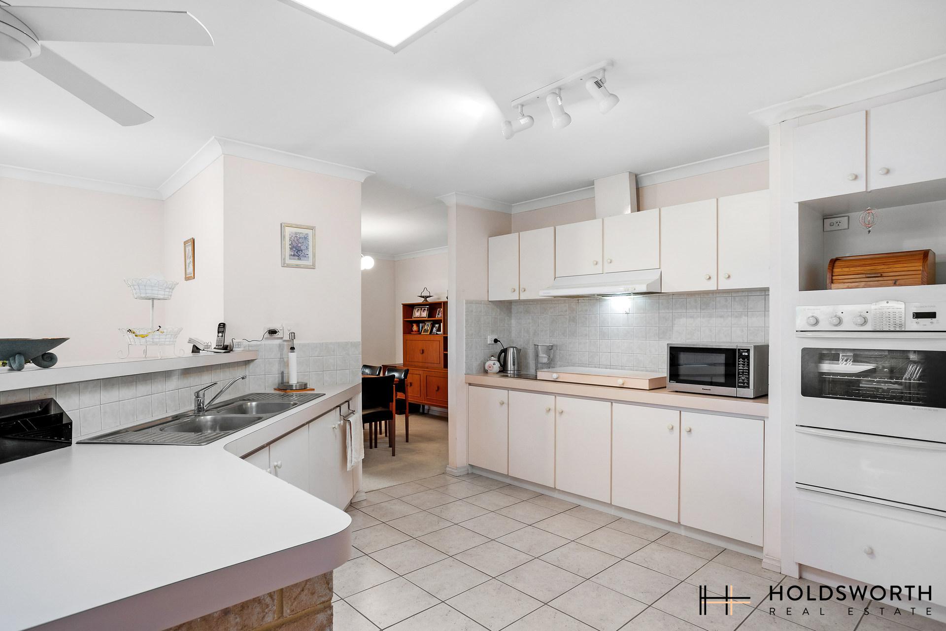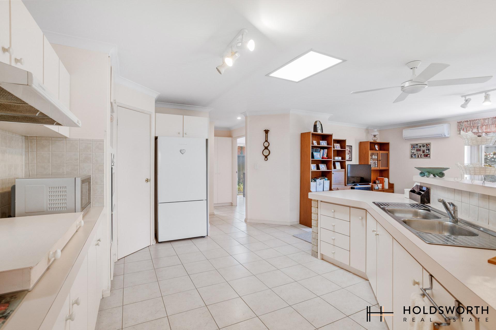 • Huge kitchen with ample cupboard and bench space, pantry, fridge recess, tiled splash back, rangehood, microwave recess, double sink, and breakfast bar