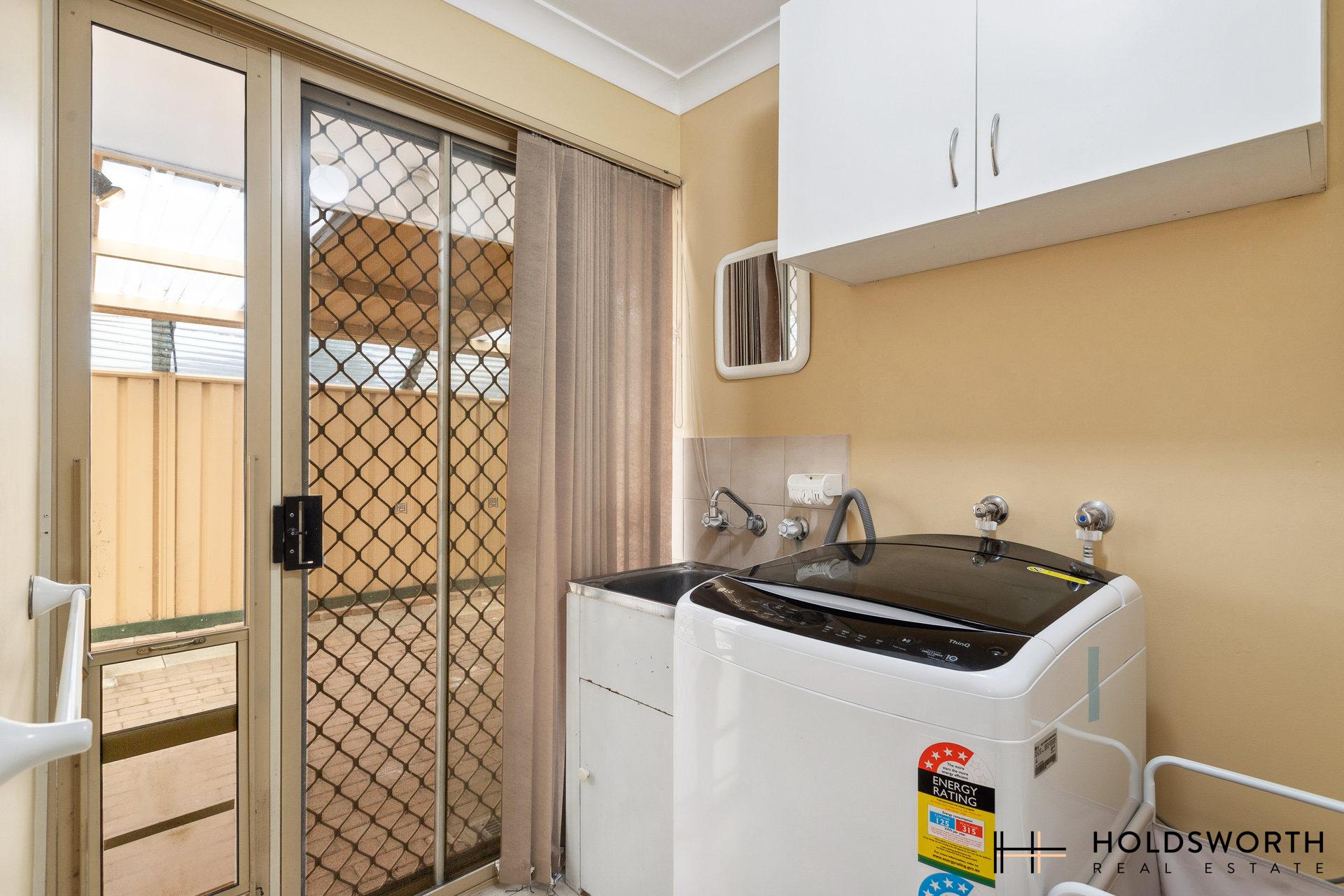 • Laundry with single sink, overhead cupboards and separate WC
