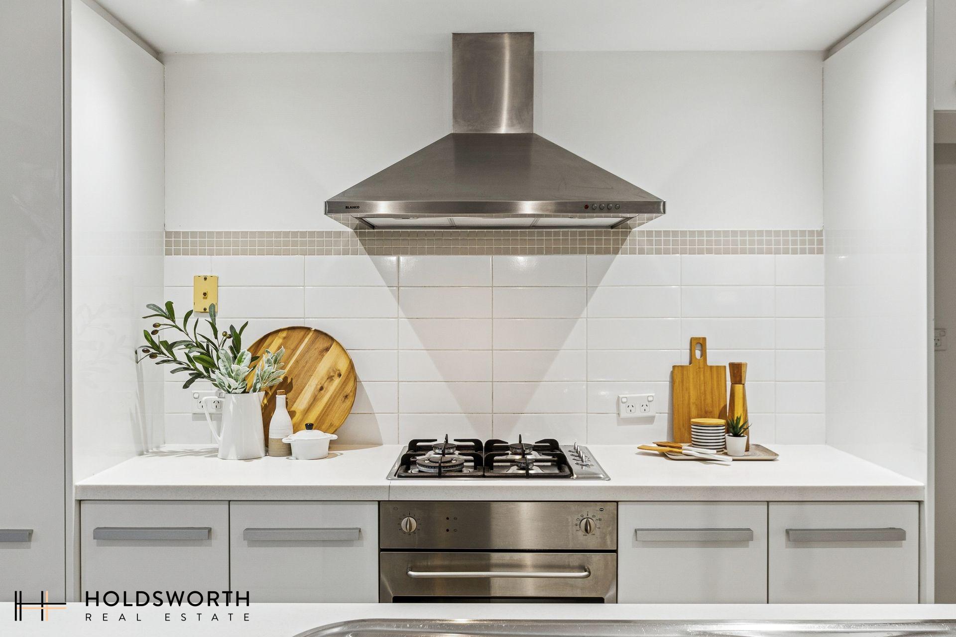 • Well-equipped kitchen with island bench, stone benchtop, quality appliances, and sleek bulkhead